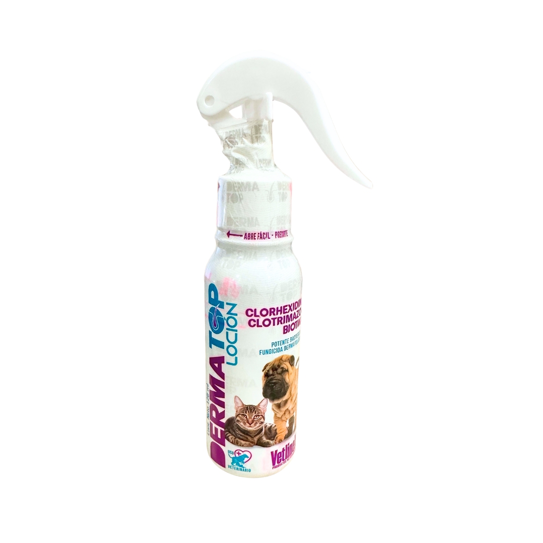 DERMA TOP VETLINEX es una loción antimicótica, antibacterial y generador para perros y gatos, que ayuda a mantener una piel y pelaje saludables. Su fórmula única y suave limpia y protege la piel de tu mascota. ¡Cuida a tu mejor amigo con DERMA TOP VETLINEX!