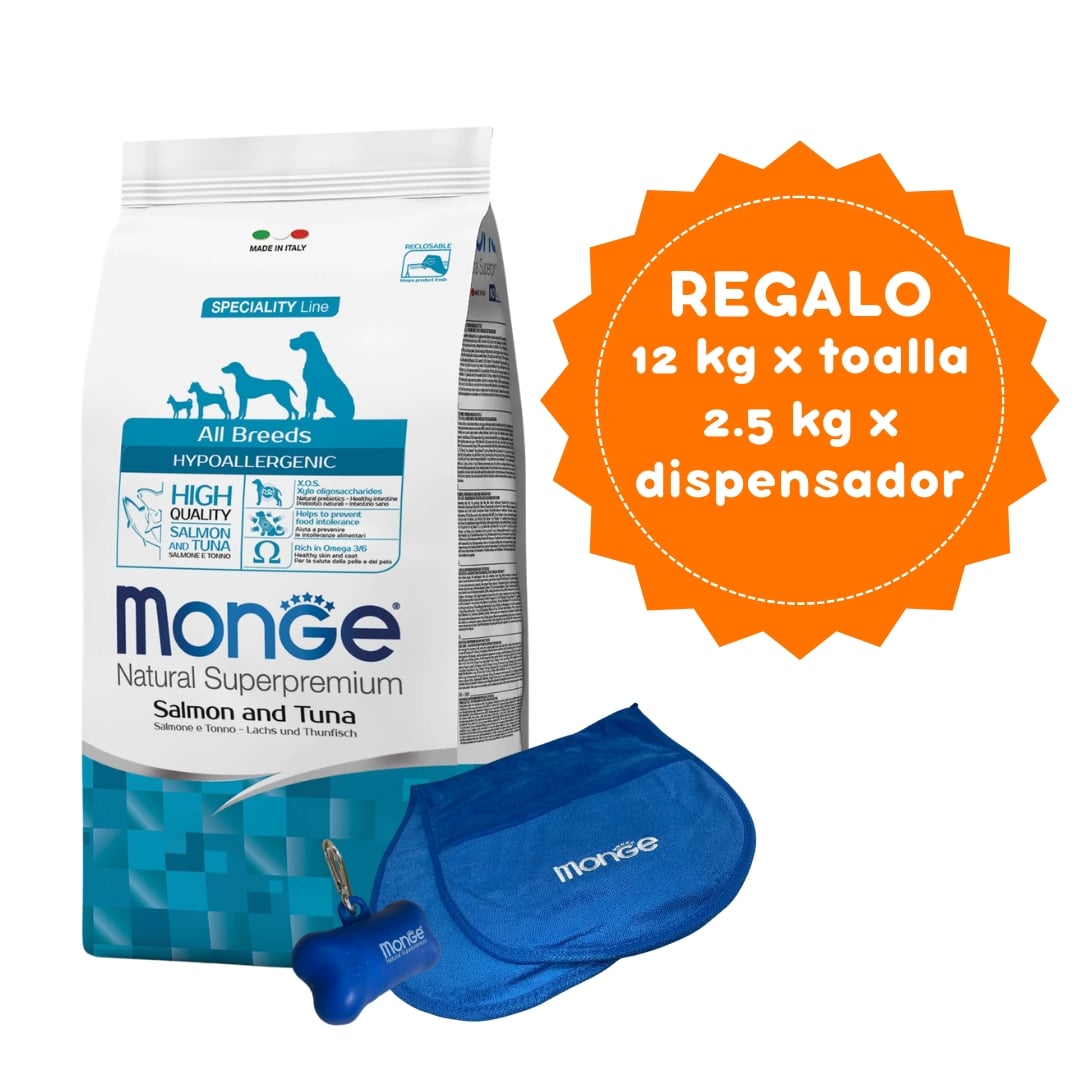 Monge Natural Superpremium Línea Hipoalergénica con salmón y atún es un alimento dietético completo para perros adultos, formulado para reducir las intolerancias de ingredientes y nutrientes con una fuente de carbohidratos seleccionada (arroz).